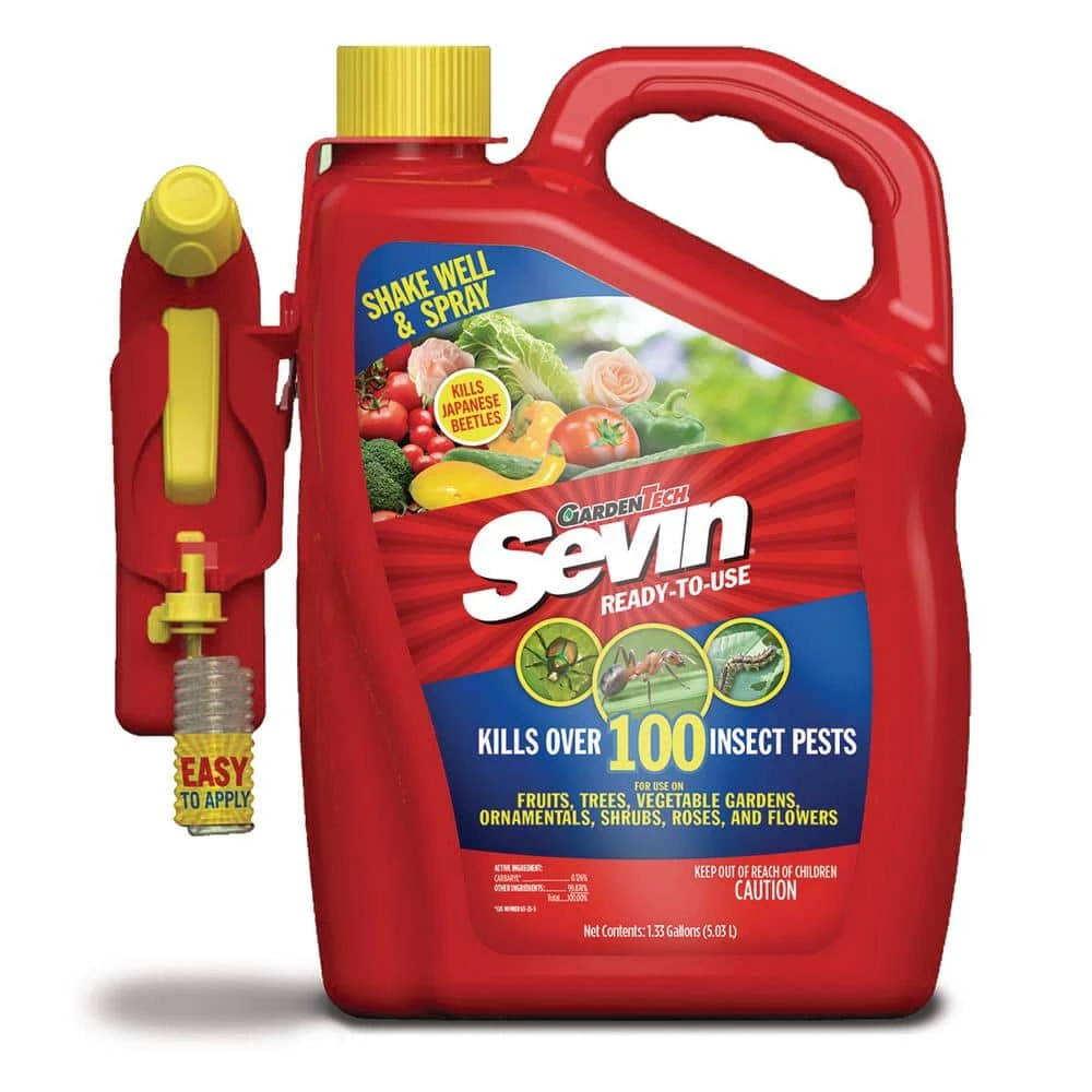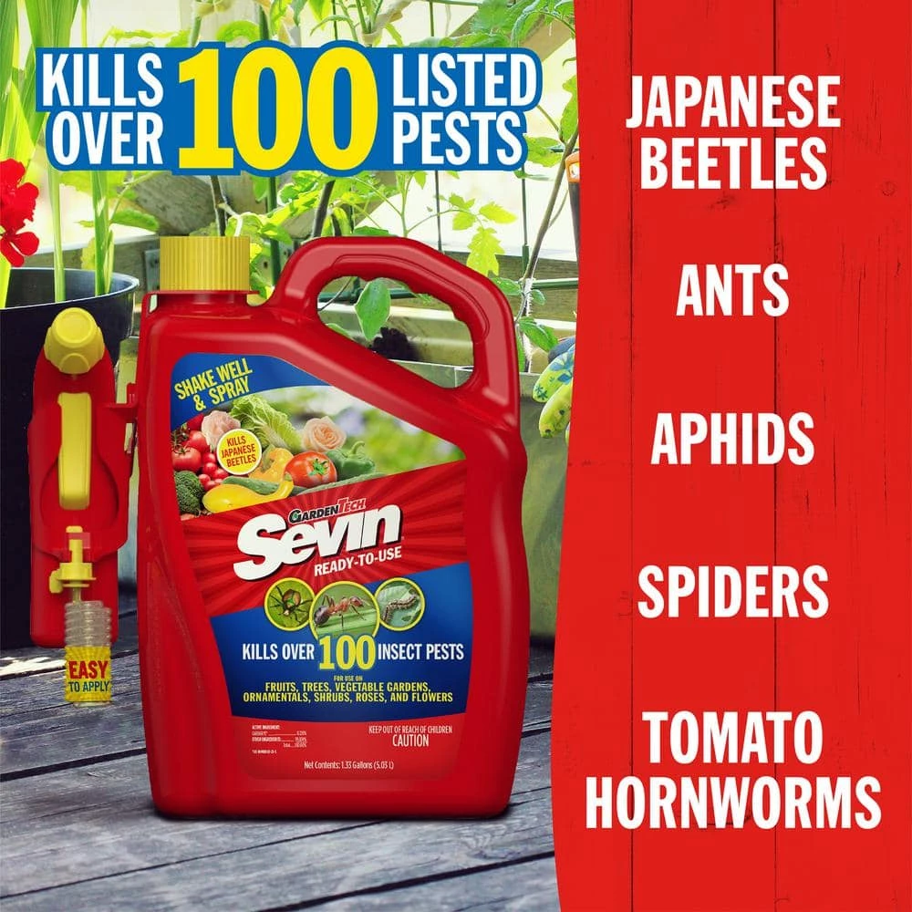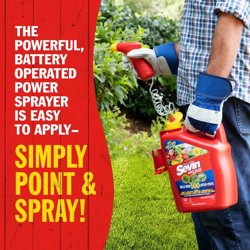 Sevin Ready-To-Use Lawn Insect Killer with Battery Powered Sprayer (batteries included) kills over 100 listed insects on vegetables, fruits and ornamentals. Use the power sprayer to spray thoroughly on all surfaces of plants to control nuisance pests such as fleas, ticks, spiders, Japanese beetles and outdoor roaches. Use in your lawn care throughout the growing season to kill insects with short pre-harvest intervals for edibles.
