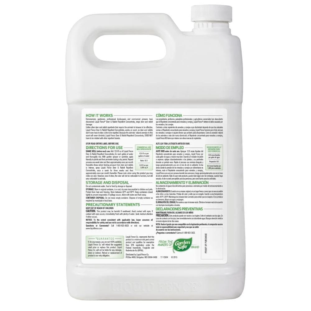 Don’t let animals have the pick of the garden before you can. Deer, rabbits, moles and other four-legged pests enjoy your lawn and landscape as much as you do – hit them in the nose so they won’t come back. Liquid Fence animal repellents use scent- and taste-deterring formulas that won’t harm animals or plants when used as directed. Invisible barrier. Clear results.Liquid Fence Deer & Rabbit Repellent Concentrate2 repels deer and rabbits before they feed. This concentrated liquid formula repels deer and rabbits from landscaped ornamental gardens, flowers, shrubs, trees and vines. The repellent works on scent, so deer and rabbits don’t have to take a bite to be repelled. It is harmless to plants and animals when used and stored as directed, and can be applied year-round. The formula is long-lasting and rain resistant.Animals’ natural aversion to this scent will never diminish – this product does not have to be rotated with other repellent brands. Reapply once a week for 3 weeks, then approximately once a month thereafter. Reapplication is recommended after excessive rainfall.