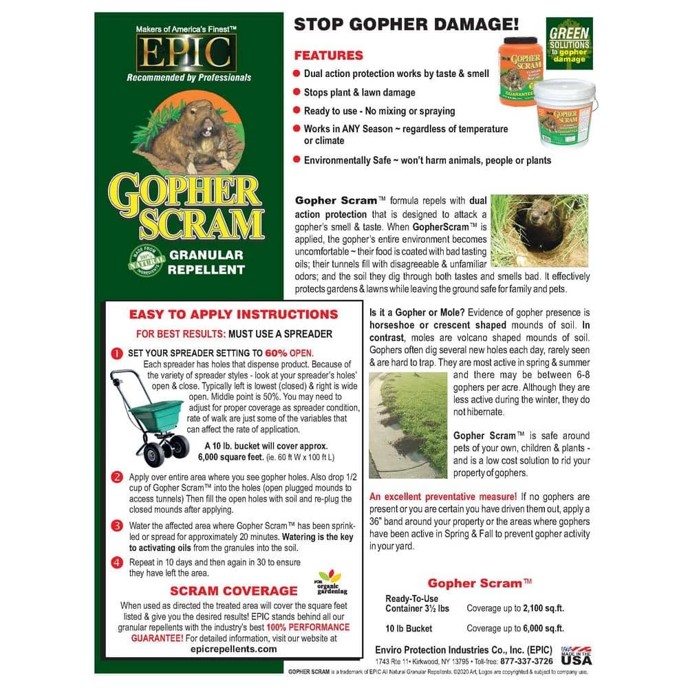 Gopher Scram repels with dual action protection that is designed to attack a gopher’s smell and taste. The gopher’s entire environment becomes uncomfortable – their food is coated with bad tasting oils, their tunnels fill with disagreeable and unfamiliar odors, and the soil they dig through both tastes and smells bad. Ready to use – no mixing or spraying. Works in any season regardless of temperature or climate.