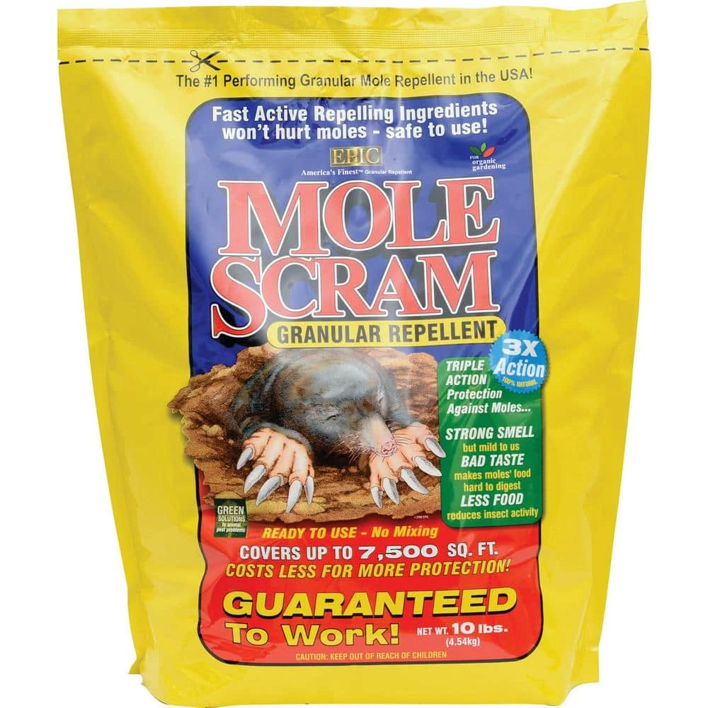 Mole Scram is proven to quickly reduce and eliminate mole activity 3 ways: Bad taste from natural distasteful ingredients, less food reduces insect activity and strong smell (mild to us) affects moles senses. All season ready to use granular formula. Environmentally safe – ideal around organic gardens.