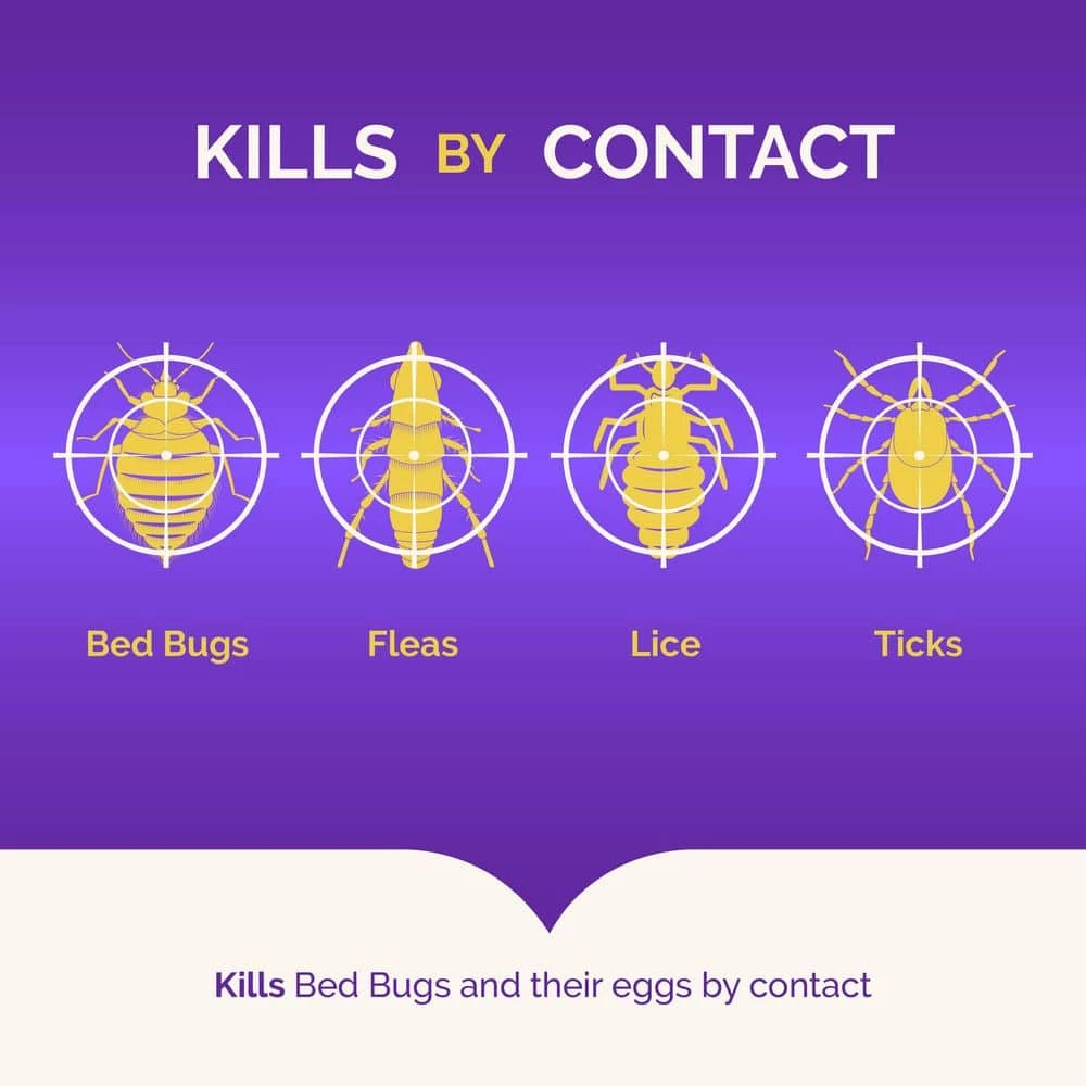 - Bed bug treatment: this product kills bed bugs and bed bug eggs, as well as crawling insects, brown dog ticks, fleas, dust mites, clothes moths and carpet beetles