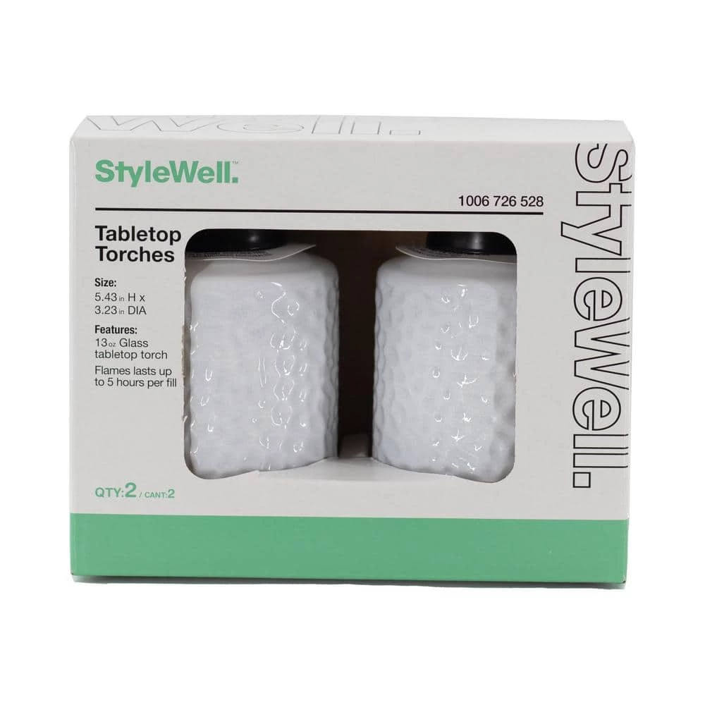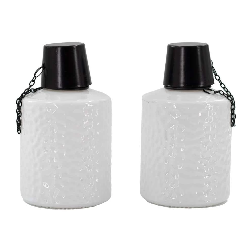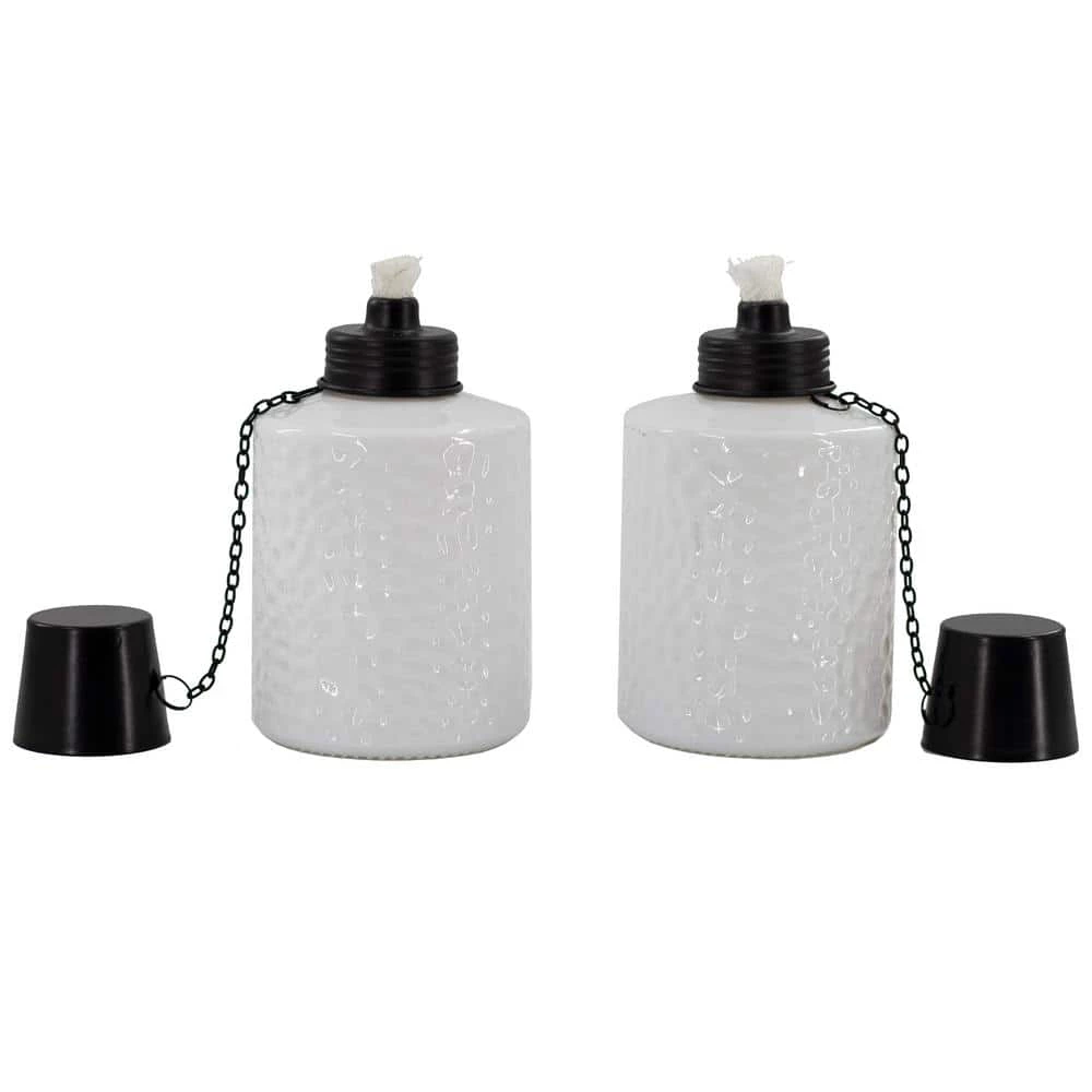 Add a touch of sophistication to your outdoor space with this White Glass Tabletop Torch, 2-Pack. You’ll love the sleek look of the glossy white torch with the contrasting black matte metal lid and snuffer. Their simple, sophisticated design seamlessly blends with any decor style so you can enjoy them on your patio dining table or on a coffee table on your front porch, making them the perfect outdoor replacement for taper candles and candlesticks.