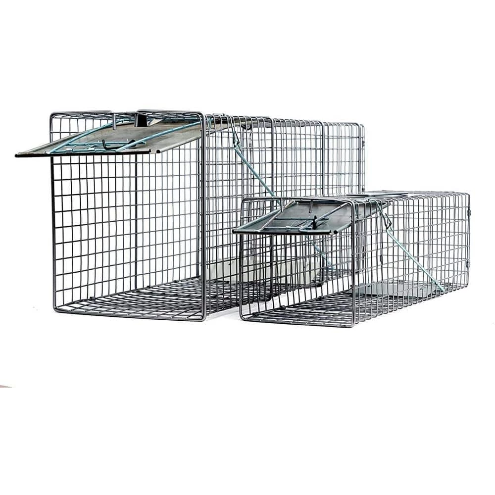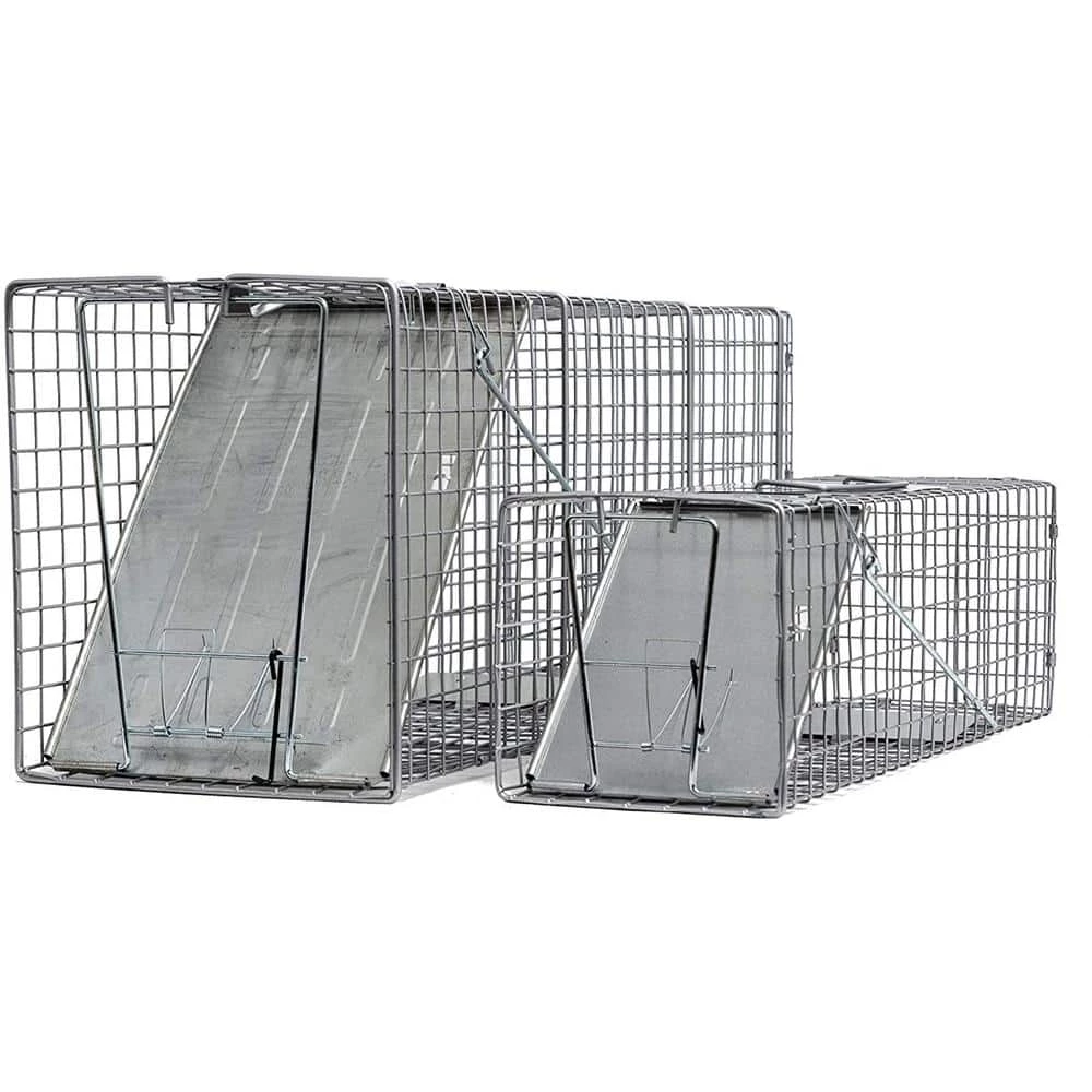 - 2-fully assembled, ready-to-use catch and release animal traps – large: 32 in. x 10 in. x 12 in., medium: 24 in. x 7 in. x 7 in.