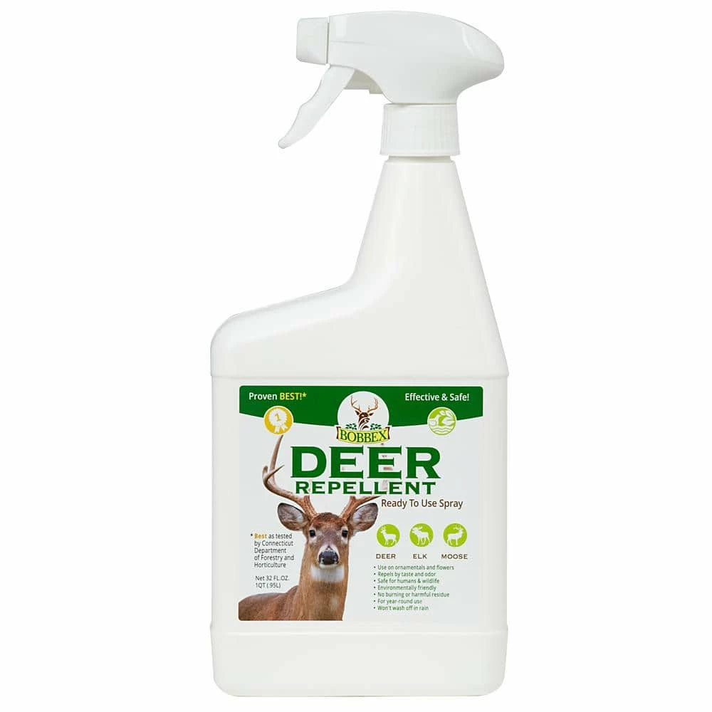 Bobbex Deer Repellent is a topical, proven effective foliar spray used to deter and prevent deer, axis, moose, and elk from browsing and causing other damage to ornamental plantings, shrubs, and forest trees. Bobbex is a blend of all natural ingredients that are beneficial and totally innocuous to plant development. The active ingredients are a series of proteins making the product extremely safe for use on the most sensitive plantings and are harmless to all wildlife including humans, pets, birds and aquatic life. Bobbex has been independently tested by the Connecticut Agricultural Experiment Station against ten (10) known competitors and was found to be 93% effective, second only to a physical barrier. The combination and multiple redundancy of repelling ingredients make Bobbex a superior product over competitors. Bobbex works by smell and taste aversion, can be applied in almost any climate or temperature and will not burn plant material. Bobbex will not wash off. The product contains an extremely effective sticking agent that will last through several heavy rains and hosing. Bobbex dries clear and although there is a slight odor, it will dissipate within 24 hours of application (to humans but not to deer). This 32 oz. ready-to-use formula comes with its own trigger sprayer.