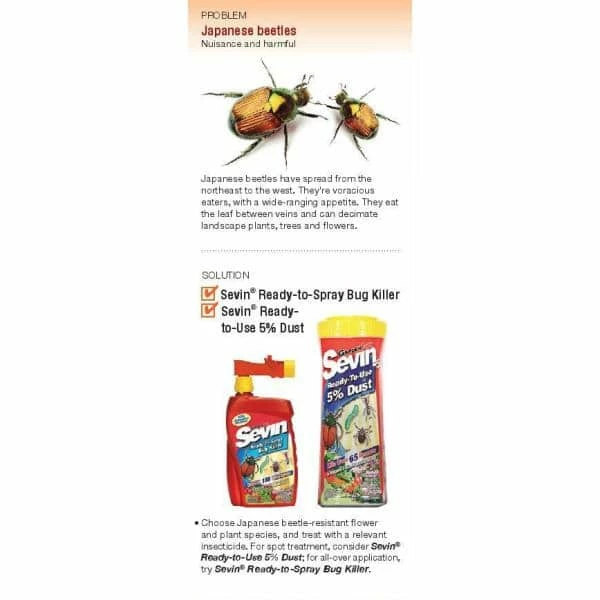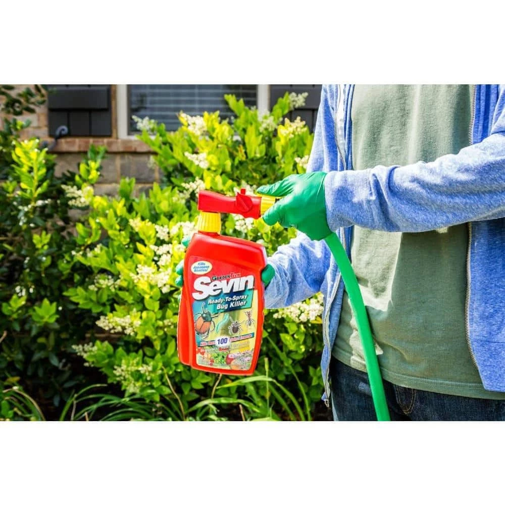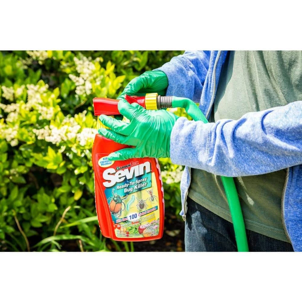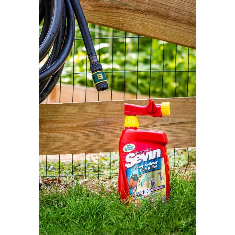 Sevin Ready-to-Spray Bug Killer kills over 100 listed insects on vegetables, fruits, and ornamentals. Attach your garden hose to the spray nozzle to protect plants and controls nuisance pests such as fleas, ticks, spiders, Japanese beetles and outdoor roaches. Use in your lawn care throughout the growing season to kill insects with short pre-harvest intervals for edibles.