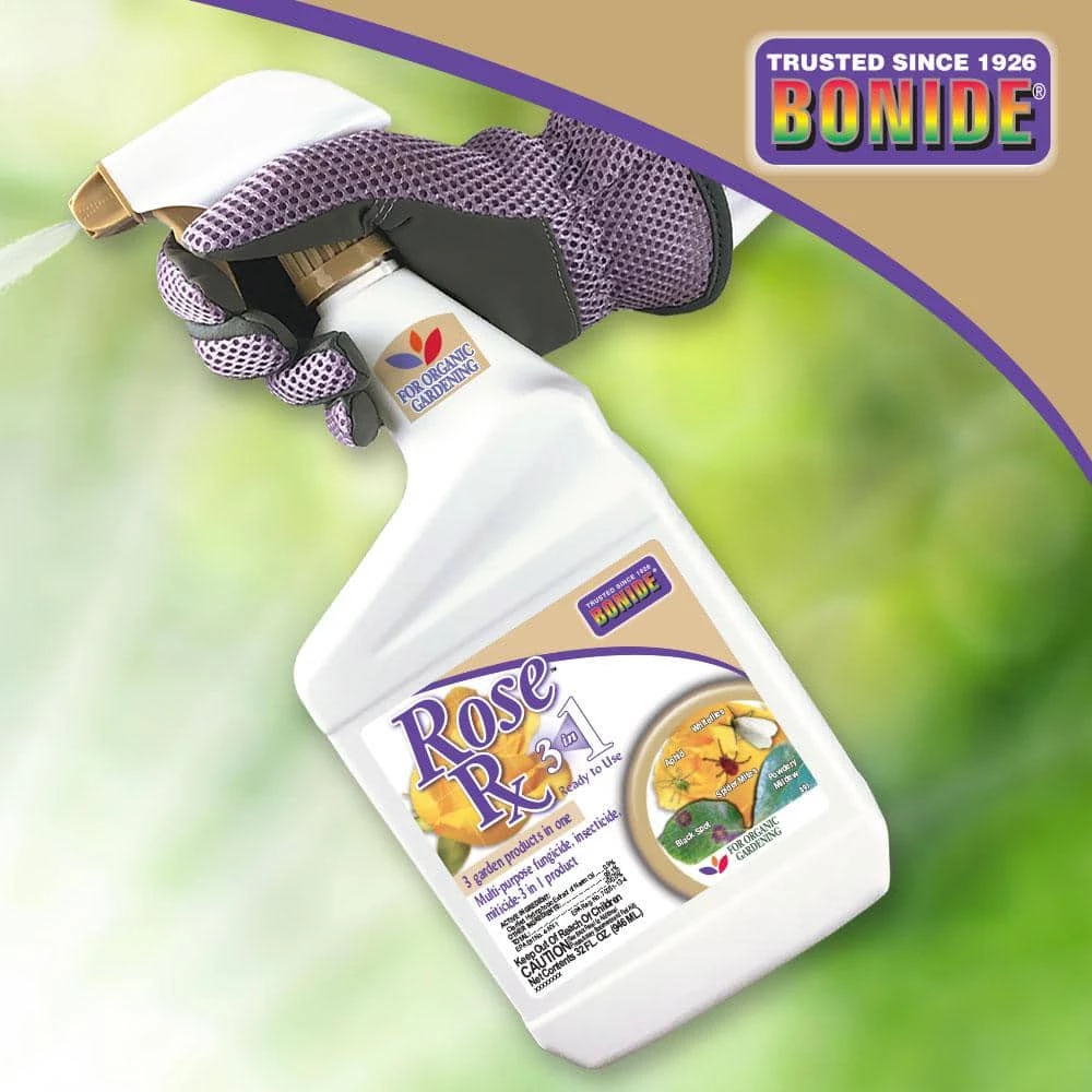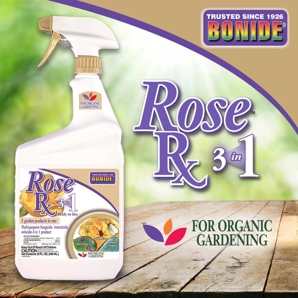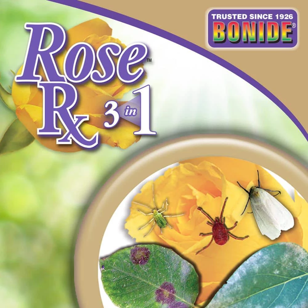 BONIDE Rose Rx (3-in-1), insecticide, fungicide, miticide for organic gardening. Controls plant disease, mites and all stages of insect life cycles. Use on roses, flowers and more.
