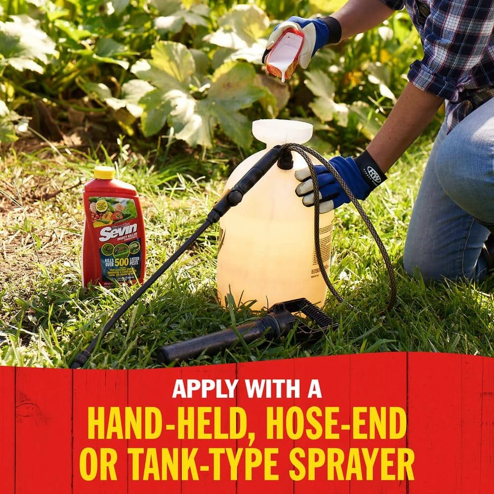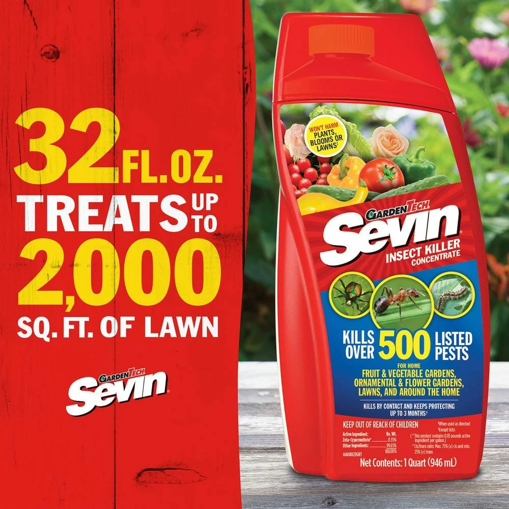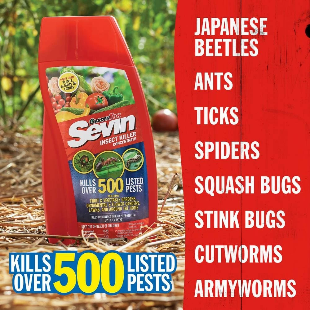Sevin Insect Killer Outdoor Concentrate kills over 500 listed insects on vegetables, fruits, flowers, ornamentals, lawns and around the home perimeter. Simply mix with water as directed and apply with a sprayer (not included) to protect plants and controls nuisance pests such as ants, fleas, ticks, spiders, Japanese beetles, aphids, cabbage worms and outdoor roaches. Use throughout the growing season to kill insects with short pre-harvest intervals for edibles. Best of all, it is fast acting and protects for up to 3 months.