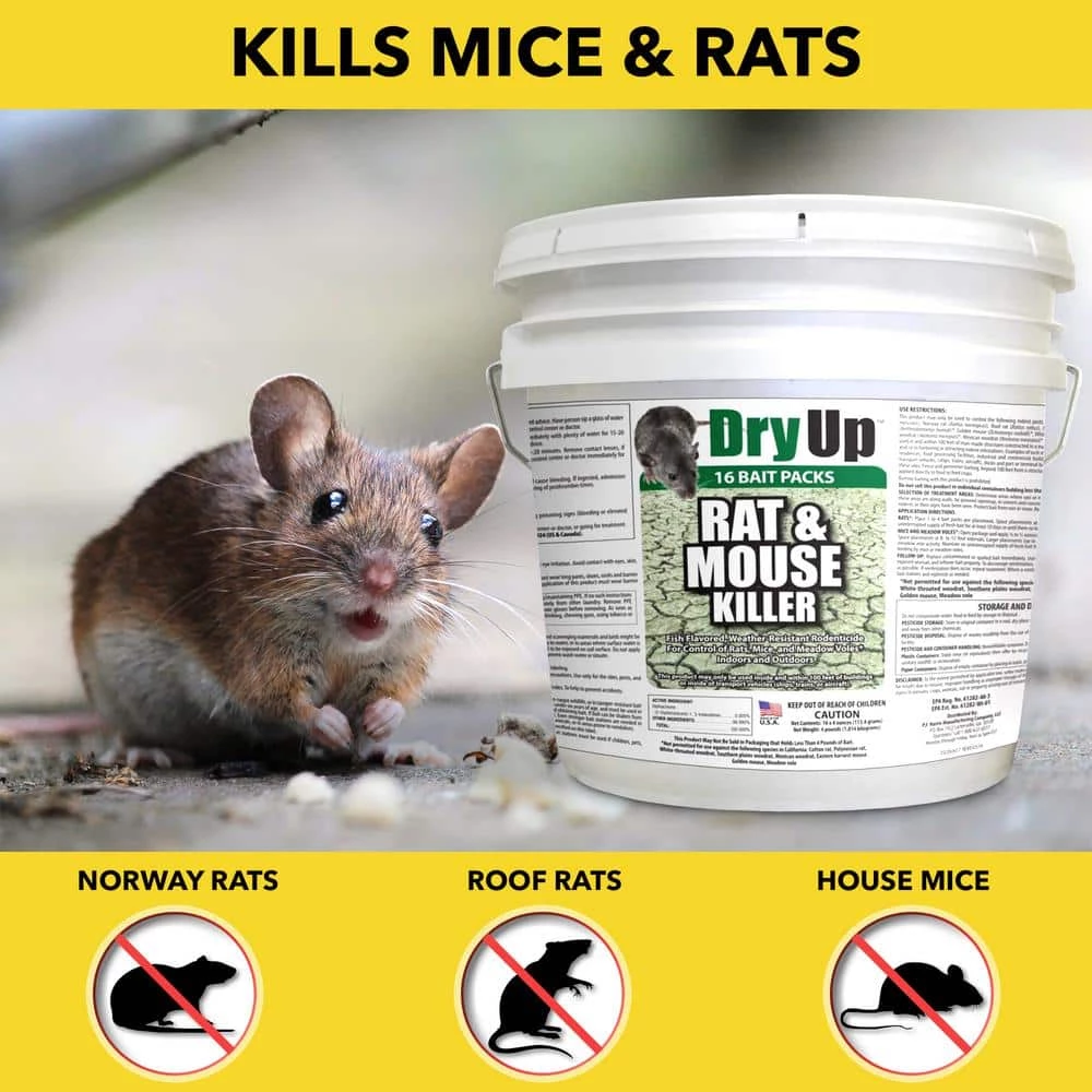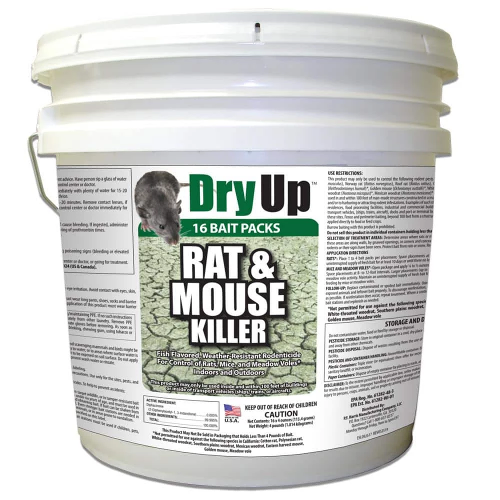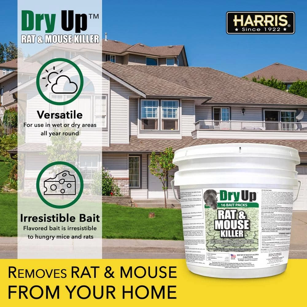 Harris 4 oz. 16-Pack Dry Up Rat and Mouse Killer Pellets kills rats and mice. Pellets are weather and mold resistant, making it effective for indoor and outdoor jobs. For best results, apply along walls, by gnawed openings, in corners and concealed places, between floors and walls or in locations where rodents or their signs have been seen. Sixteen 4 oz. bait packs included for placement in many different areas.