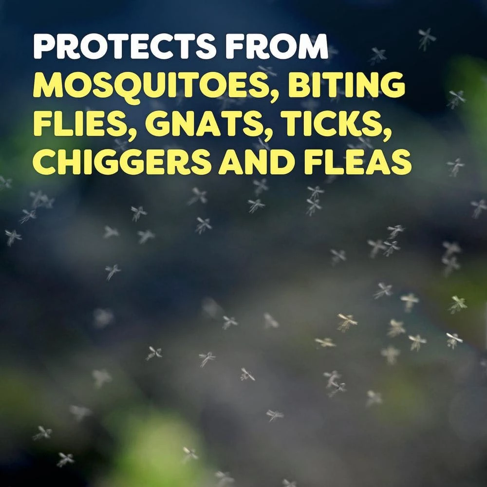 - Protects against mosquitoes, biting flies, gnats, ticks, chiggers, and fleas