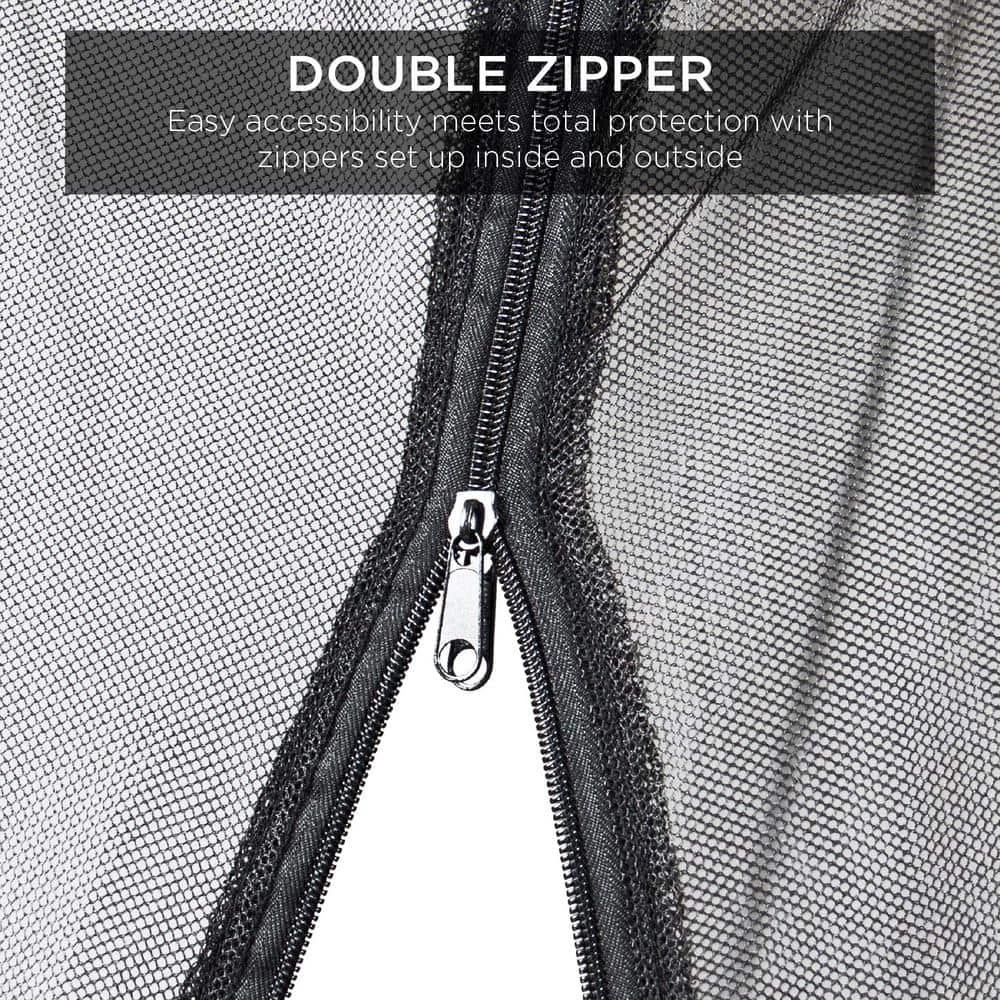 - Double zipper: a sturdy double-sided zipper system lets you come and go as you please, while still keeping your space free from annoying bugs