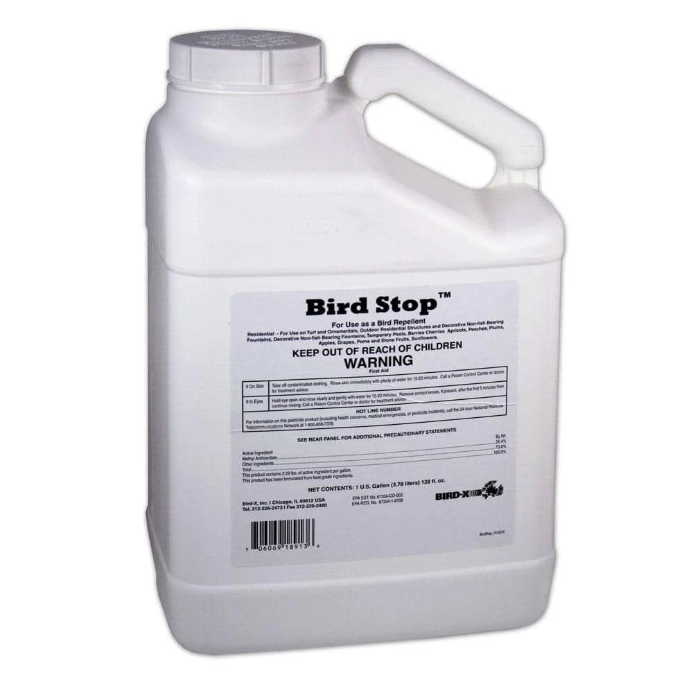Bird Stop by Bird-X is a food-grade taste aversion liquid bird repellent that tastes bad to birds and irritates birds’ sensory systems (similar to our sense of smell). Applying the bird repellent spray directly to surfaces will create a safe and effective deterrent to pest birds. Each bird repellent spray and liquid bird repellent package includes: 10 lbs. 1 Gal. jug of Bird-Stop liquid repellent. Active ingredient (methyl anthranilate) has a taste and smell that birds avoid. Liquid can be painted or sprayed onto surfaces such as grass, turf, crops and structures. Often, a single application brings permanent success after 2 to 3 applications, even stubborn birds learn not to return. Single gallon treats up to 1 acre. Repel pest birds such as geese, ducks, seagulls and other waterbirds, as well as pigeons, sparrows, starlings, barn swallows, etc. Recommended for use on outdoor surfaces, such as grass and turf, crops, trees and foliage, roofs, walls and siding, statues, bridges, boat docks and more.