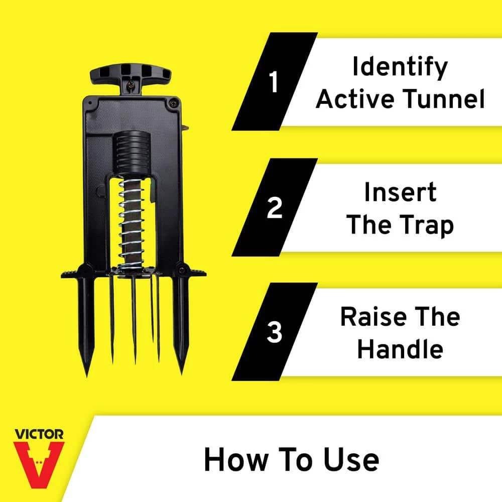 Anyone who has ever struggled to set a mole trap will appreciate how effortless it is to activate the Victor Deadset Mole Trap. The trap boasts an ergonomically designed, easy grip handle and an oversized activator plate that can be pushed into the tunnel by hand or foot, making it the easiest-to-set trap on the market. It’s also incredibly effective thanks to the precision-built trigger system, which is activated by the slightest movement. When underground movement is detected, the spears are thrust into the ground, quickly killing the mole. For your convenience, the trap comes fully assembled and ready-to-use. After identifying active tunnels, collapse a portion, then use the foot pegs to set the trap in place in the softened ground. Raise and lower the handle until the spears move freely in the ground. Then, with feet on the foot pegs, raise the handle to set the trap. You can have peace of mind in knowing that the traps spears are located below ground, away from children and pets.