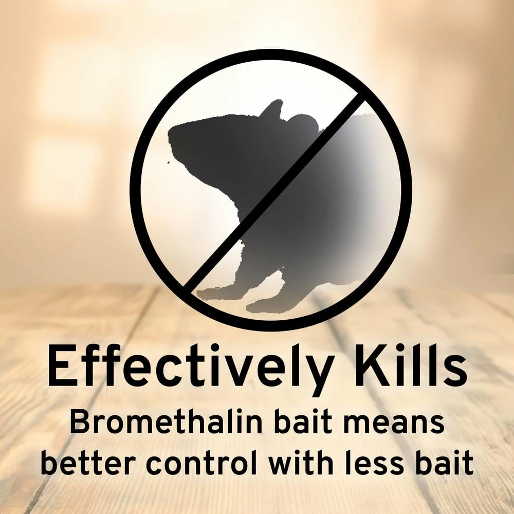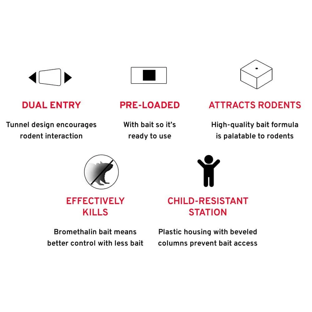 - Child-resistant plastic casing with beveled columns to prevent bait access