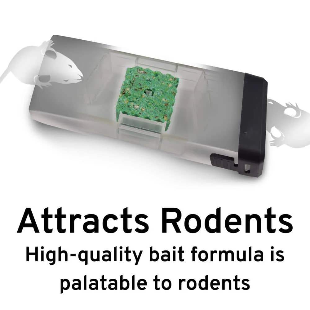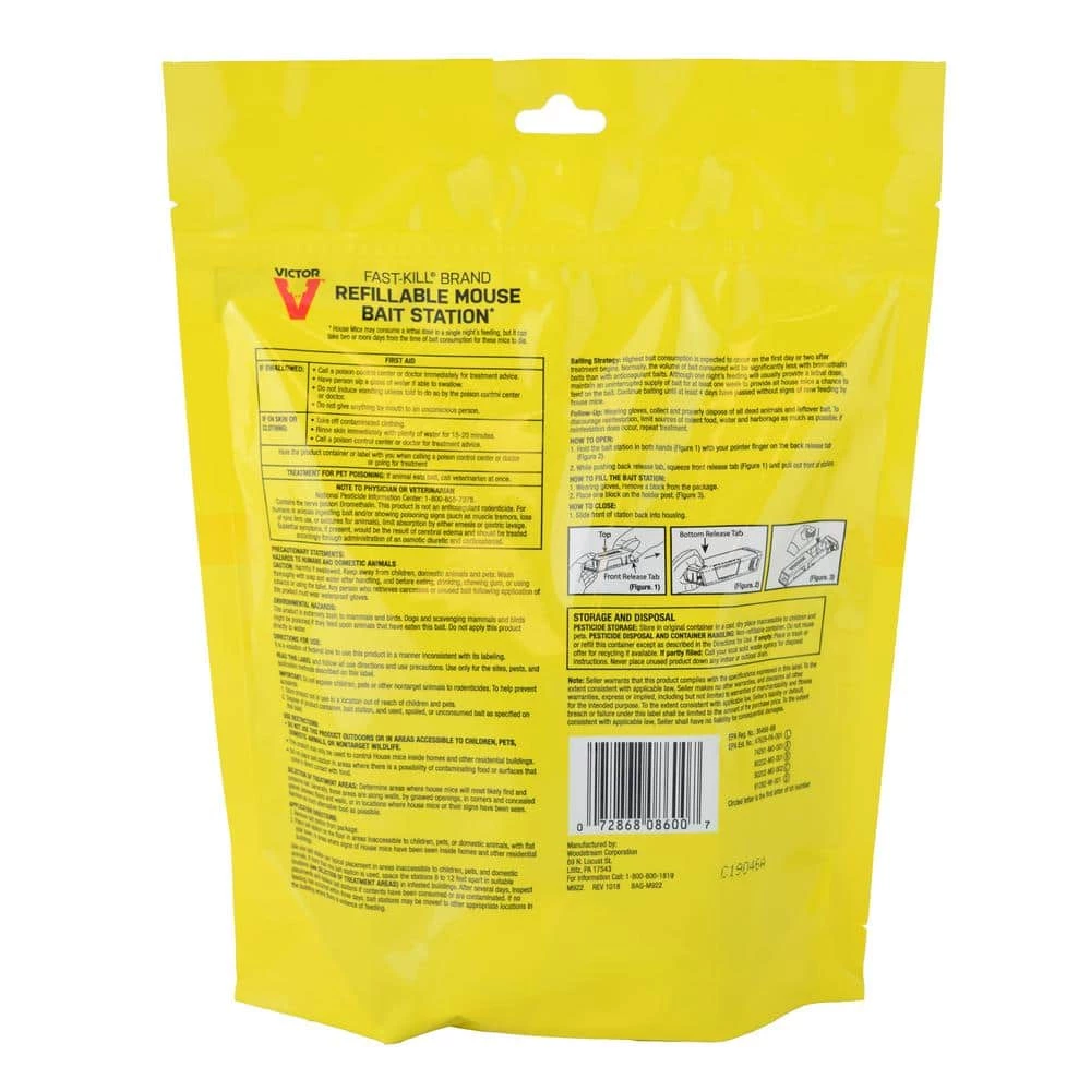 Do you have an on-going issue with mice around your property. Victor Fast-Kill Brand Refillable Mouse Bait Stations have got you covered. The bait station arrives pre-filled with a single-feed non-anticoagulant rodenticide, so that its ready to use upon opening the package. The bait is made of high-quality ingredients that rodents find incredibly palatable, so its easy to attract them to the bait station. To use, simply place the bait station in areas of high rodent activity. The dual-entry tunnels are designed with rodent travel habits in mind, encouraging interaction with the bait station and allowing easy access to the bait. Thanks to the unique formulation, rodents will stop feeding after eating a lethal dose. This allows you to control more rodents with less bait. When the bait is depleted, simply open the bait station and use the included gloves to refill with a new bait block. For peace of mind, this bait station is constructed with a child-resistant plastic housing that locks into place to prevent it from being easily opened. Interior beveled columns also prevent small fingers from reaching in and touching the bait.