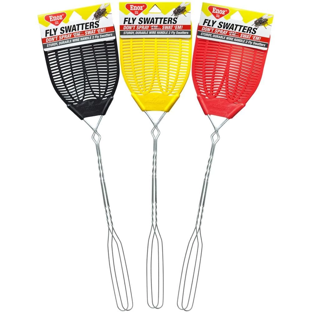 Flyswatters are the first line of defense against flying insects. Enoz Flyswatters have sturdy wire handles and durable plastic flappers. Value pack contains 2 environmentally-friendly flyswatters. Don’t spray ’em, swat ’em.