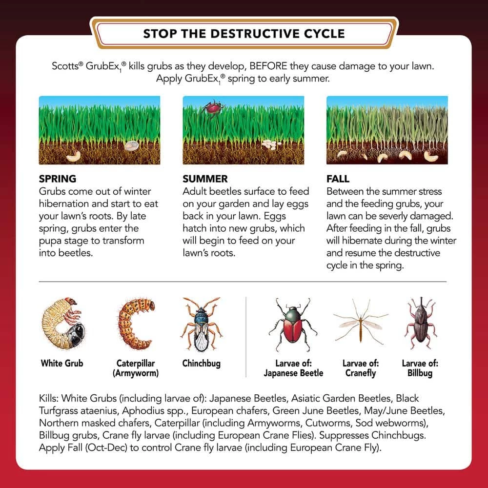 A single application of Scotts GrubEx stops grubs all season long. Scotts GrubEx kills 25% more grub types versus original Grubex. Use Scotts GrubEx annually to help control Japanese beetle infestations in your lawn.