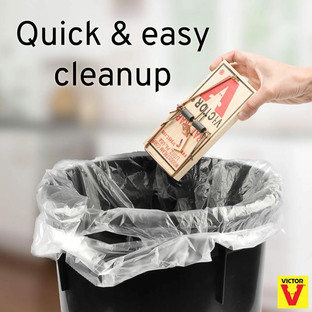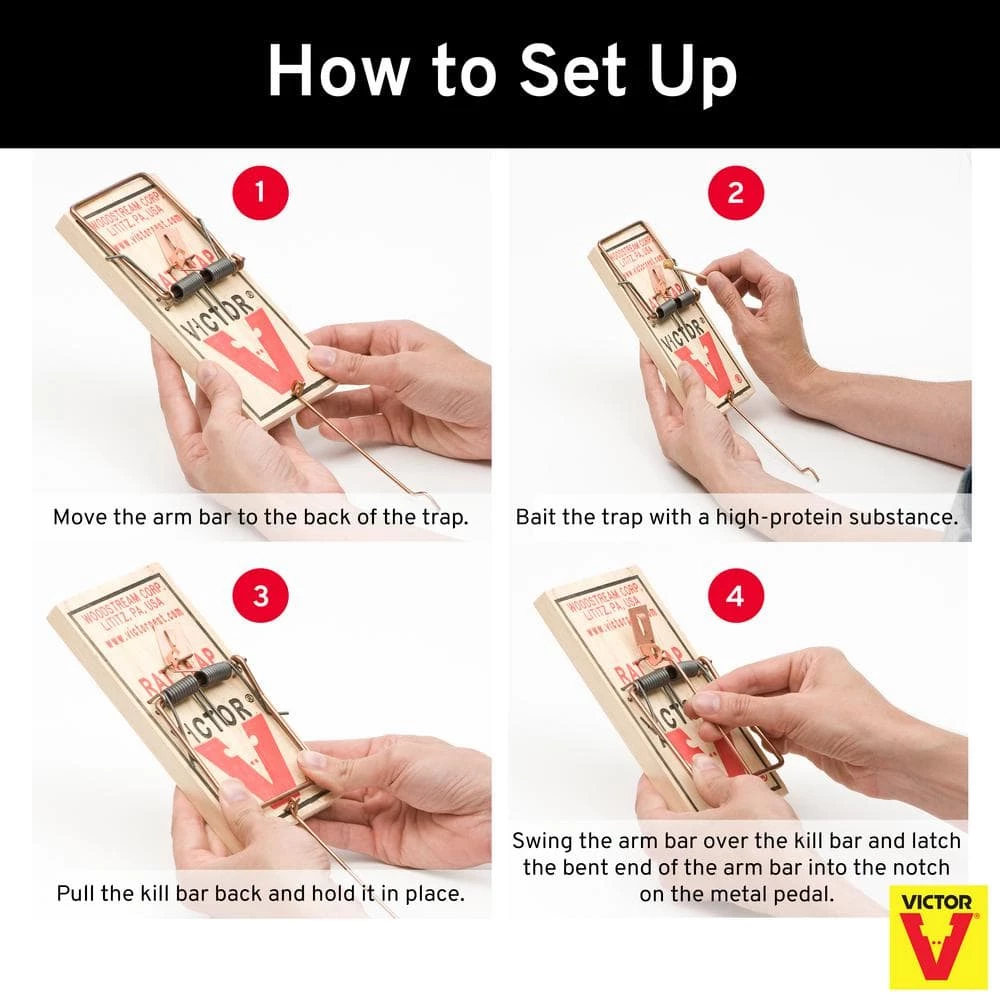 The Victor Metal Pedal Rat Trap is the original wooden snap trap. It’s also the world’s No. 1 selling rat trap for one simple reason – it works. Its superior quality and effectiveness are the reason Victor has sold more than 1 billion snap traps around the world. Once a rodent triggers the pedal, the trap immediately springs closed to eliminate the pest. After a catch, simply throw away the entire trap for quick cleanup or dispose of the rat and reuse the trap. Set the baited trap in areas where you have noticed high levels of rodent activity. Rodents tend to travel along walls, so placement in this location often works best. For maximum effectiveness, use multiple traps, placed at 2 to 3 foot intervals to increase results. Place the trap with the baited end of the trap flush against the wall.