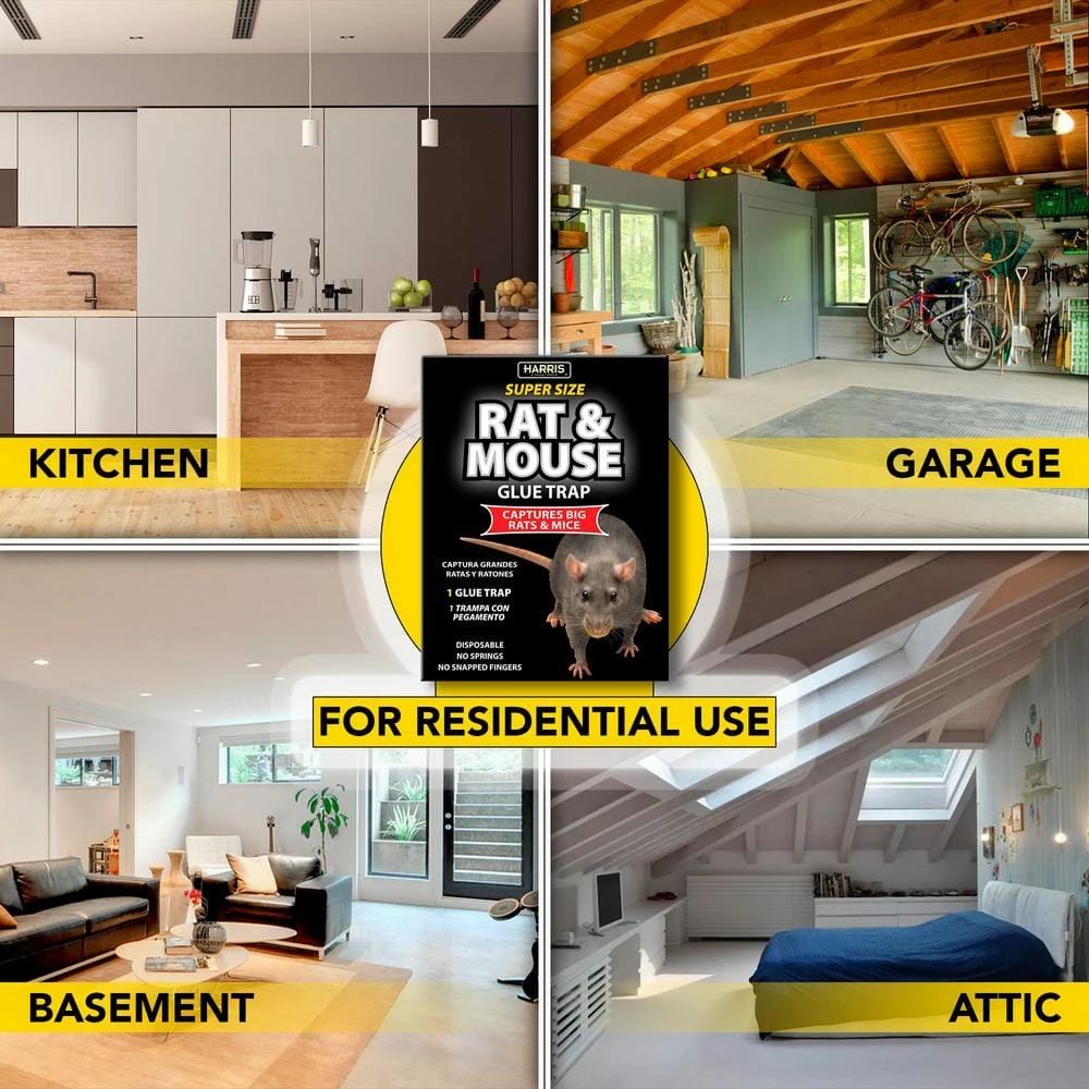 Harris Super-Size Rat and Mouse Glue Trap 3-Pack, captures big and small rats and mice. The Traps open like a book to double in size. Traps can lay flat or can be placed L shaped against a wall. The Traps are Fully Disposable. Traps are easy to use.