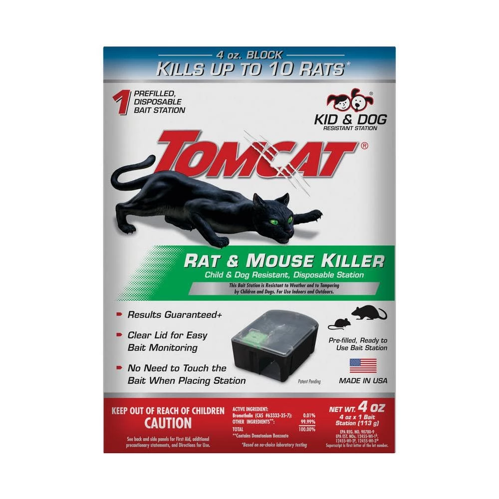 Tomcat Rat & Mouse Killer Child & Dog Resistant, Disposable Station effectively kills up to 10 rats* with 4 oz. bait block while providing the highest level of station security. Resistant to weather and tampering by children and pets, the disposable station gives rats easy access to bait and keeps fingers and pet paws out. The bait station is also weather-resistant, making it the ideal station for indoor and outdoor use. Follow all directions and restrictions on label when using the bait station. *Based on no-choice laboratory testing.