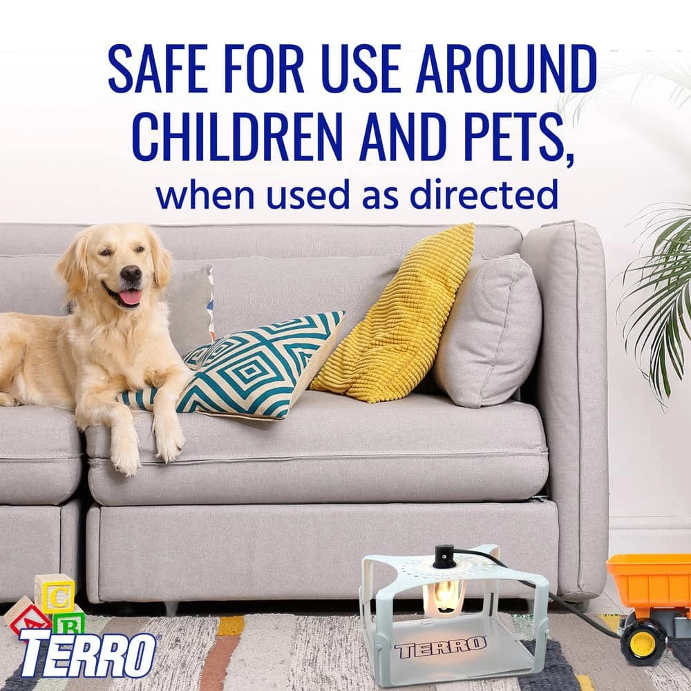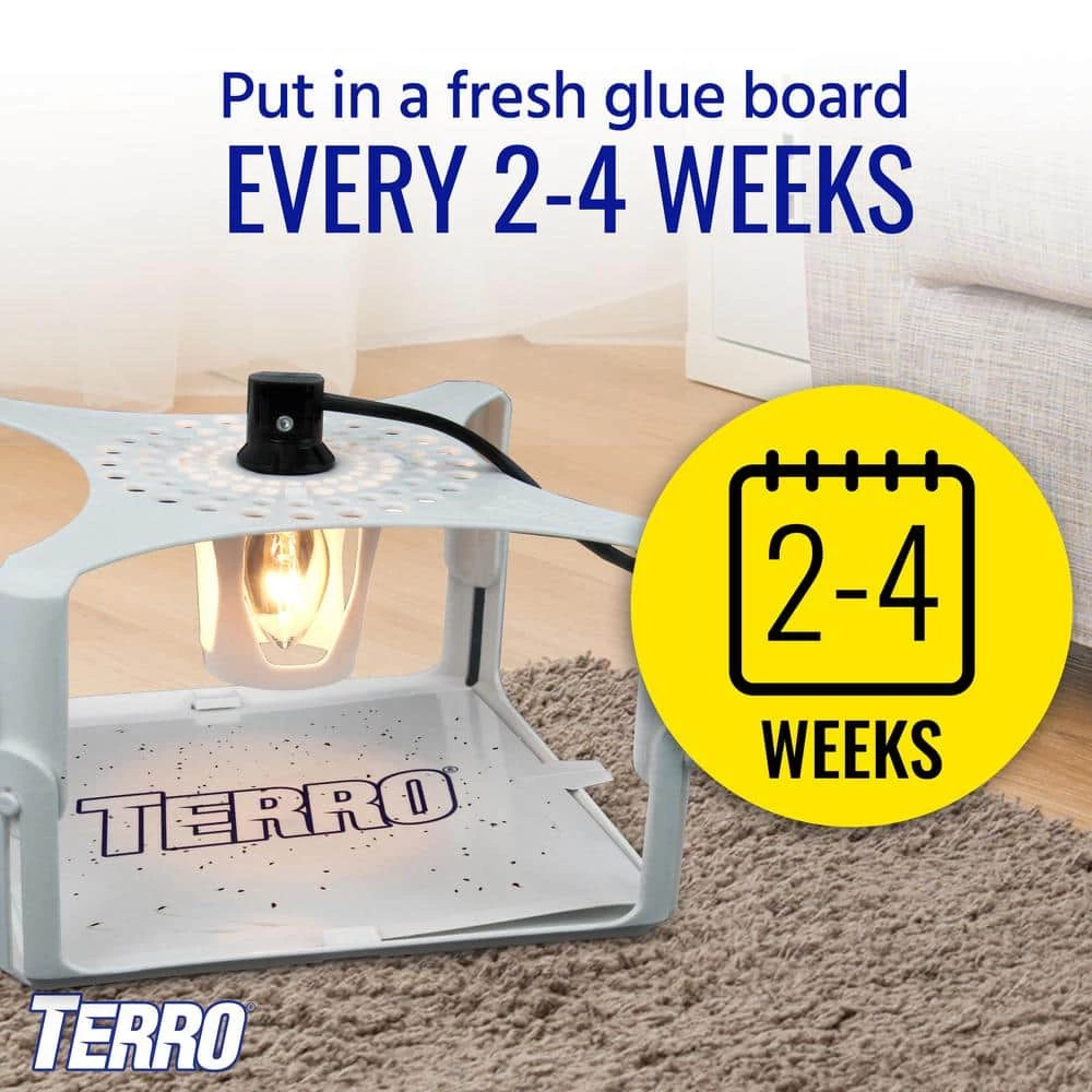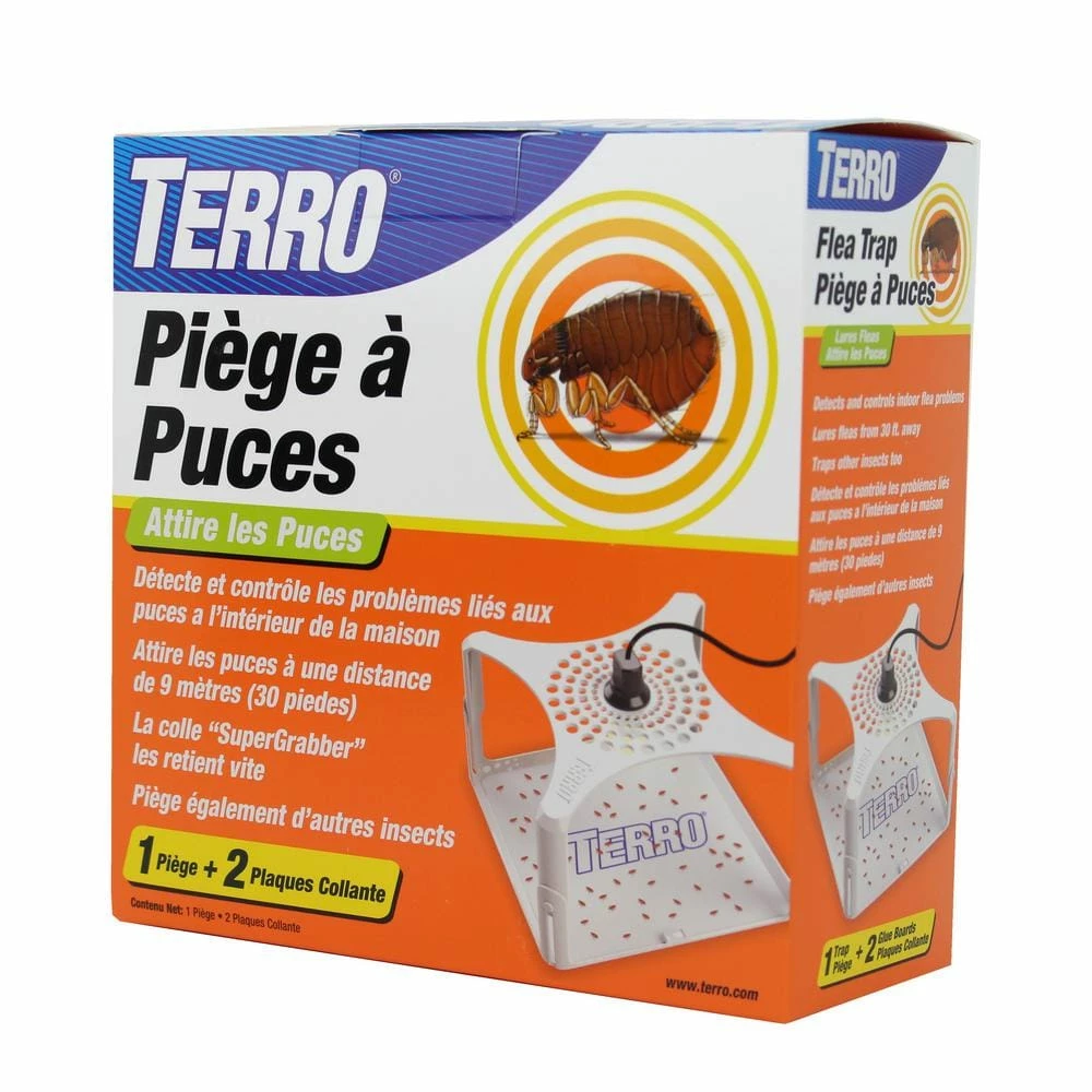 Control fleas inside your home without sprays with the TERRO Flea Trap. This trap detects, monitors, and controls flea infestations by luring fleas from up to 30 ft. away using light and heat as attractants. Fleas leap into the trap where they get stuck fast on a SuperGrabber replaceable glue board. The glue boards will also capture other insects that attempt to cross its path. This trap also features a protective canopy that keeps objects, people and pets from coming in contact with the sticky glue board. The TERRO Flea Trap is easy to use. To set up, simply extend the canopy until it clicks into place, insert the glue board and remove the release paper, then turn on the light. Place the trap on the floor in an area where fleas are common – typically where your pet spends a lot of time. Put in a fresh glue board every 2 to 4 weeks. This trap includes 2 glue board inserts, with additional refills sold separately. Why are fleas so eager to investigate the TERRO Flea Trap, Adult fleas sense heat, which to them indicates a warm-blooded animal that they typically use as a host. By simulating the warmth of the host, the flea trap attracts fleas from where they live and hide. If you’re a pet owner, you can use the TERRO Refillable Flea Trap year-round as an early detection device, luring these parasites out of upholstery, carpeting, and cracks.