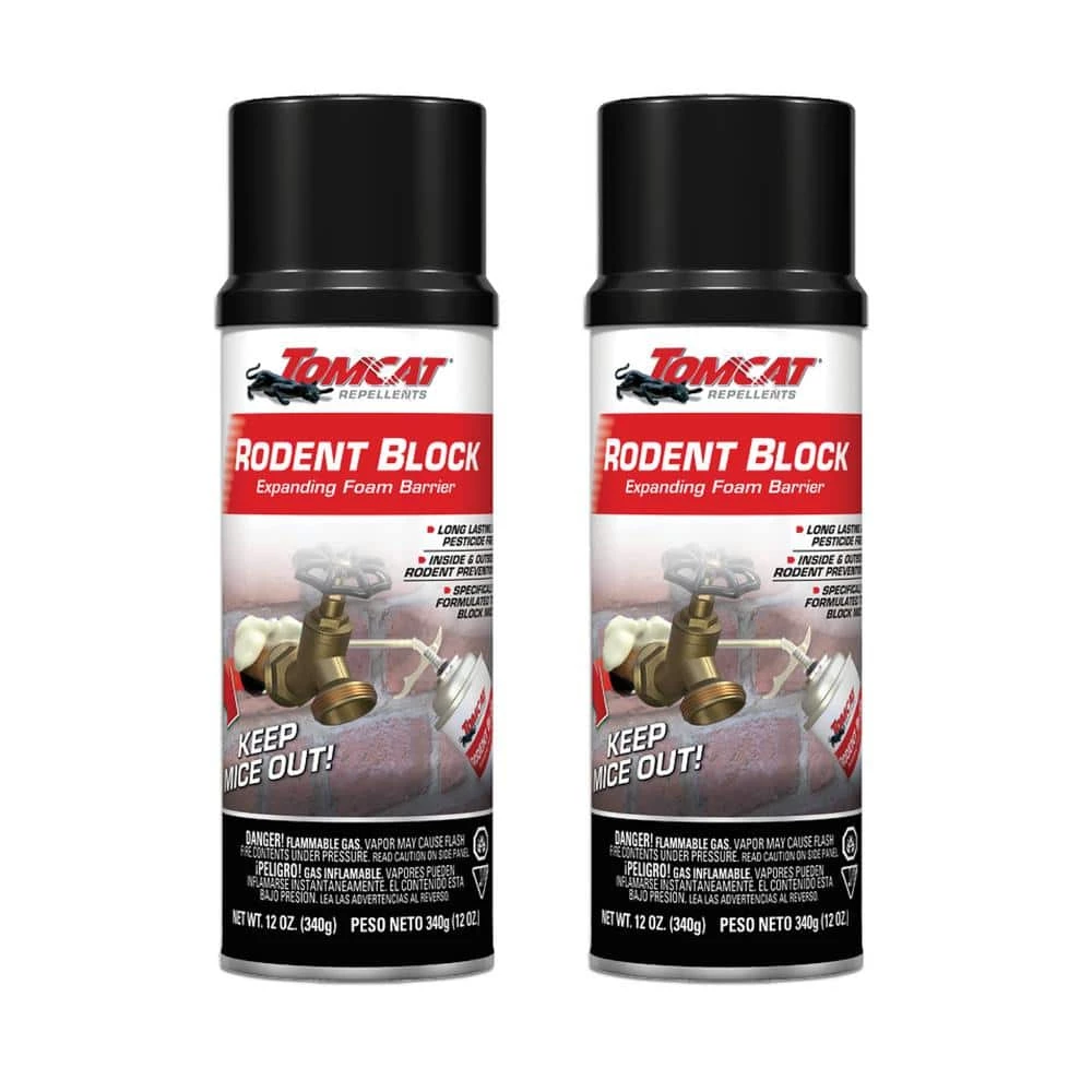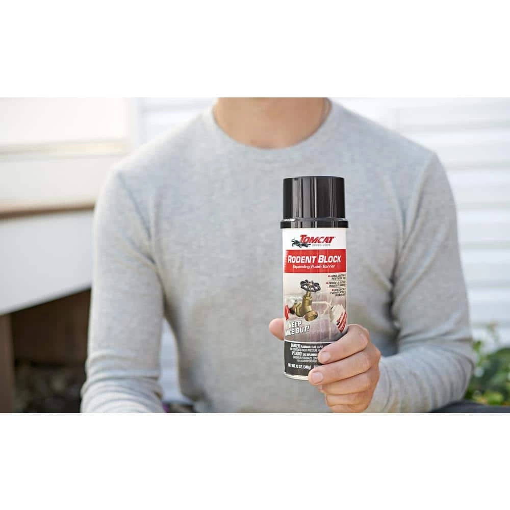 Tomcat Rodent Block Expanding Foam Barrier fills gaps and cracks to keep mice from coming inside your home. This expanding foam is specially formulated to block mice, providing a long-lasting, airtight and water-resistant bond to most building materials. The foam can be trimmed, sanded, and painted if desired. Use in crevices inside and outside your home, including the garage, attic, basement, and foundation. Tomcat Rodent Block Expanding Foam Barrier is the pesticide-free way to keep mice out.