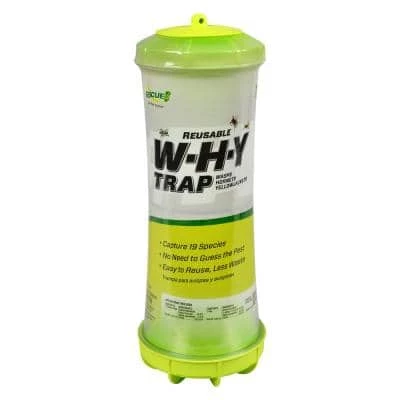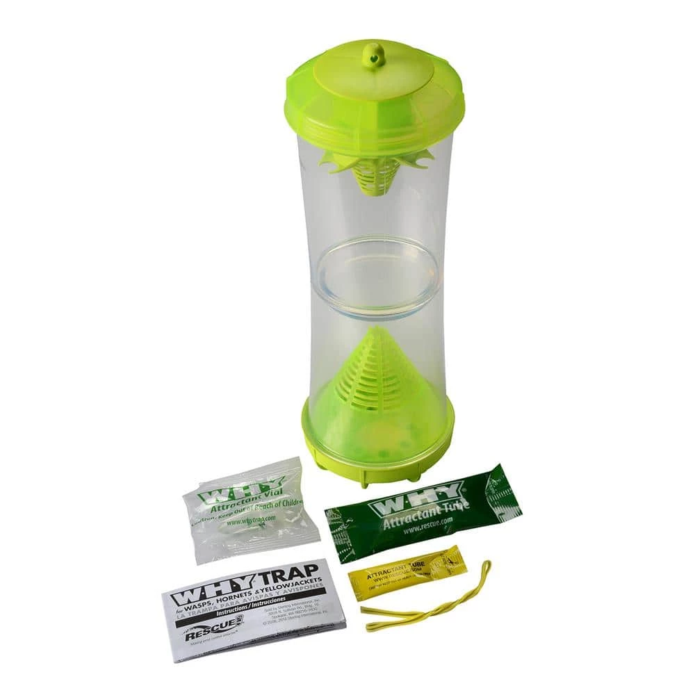 The RESCUE! WHY trap can be used outdoors wherever there is a paper wasp, hornet, or yellowjacket problem. The trap should be placed at least 20 feet away from outdoor activity areas like a patio or deck. In general, the WHY Trap will capture more paper wasps when placed near a house structure, and more hornets and yellowjackets when placed in a natural setting like a bush or tree. The included attractants do not use any poisons to kill the insects-instead, they lure insects to the trap where they can’t escape and eventually expire. This trap includes a 2-week attractant kit. Refills are available to purchase (sold separately).